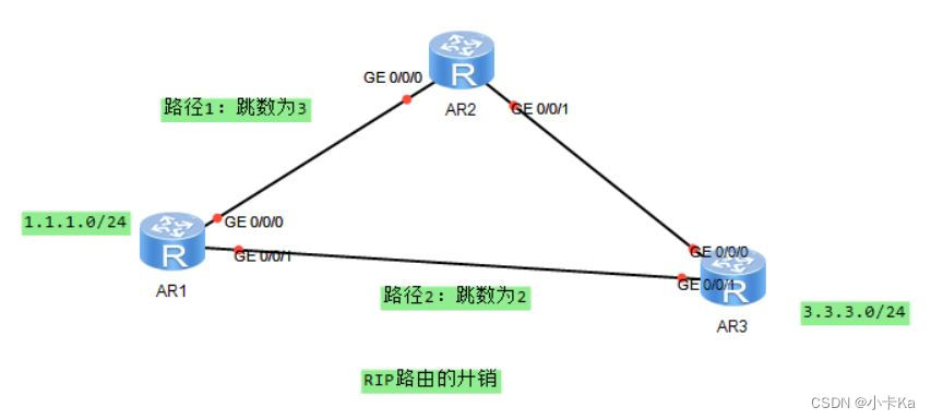 当同一种路由协议发现有多条路由可以到达同一目的地/掩码时,如果这些路由的开销是相等的,那么开销相等的路由被称为等价路由。在这种情况下,这两条路由都会被加入路由器的RIP路由表中。如果RIP路由表中的这两条路由能够被优选进入IP路由表,那么一 部分流量会根据第一条路由进行转发, 另一部分流量会根据第二条路由进行转发,这种情况也被称为负载均(Load Balance)。