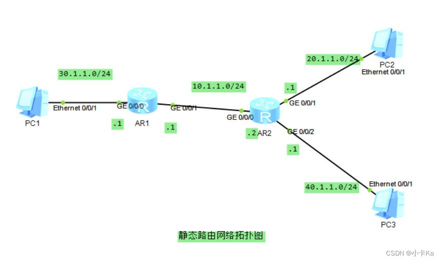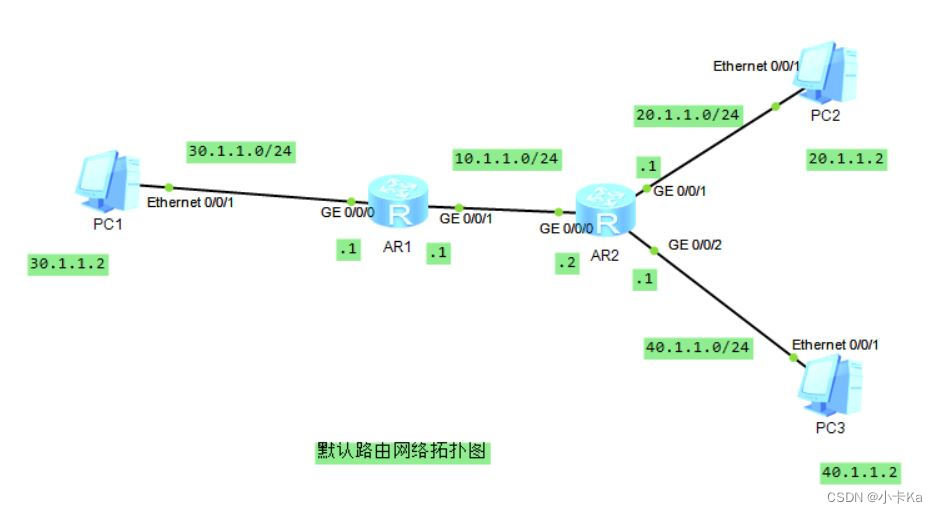 默认路由是一种特殊路由, 其网络地址和子网掩码全部为0,即目的地/掩码为0.0.0.0/0的路由。例如如下示例。一般来说管理员可以通过手工方式也就是静态方式配置默认路由。某些动态路由协议在边界路由器上也可以生成默认路由,然后下发给其他路由,如OSPF和IS-IS等。