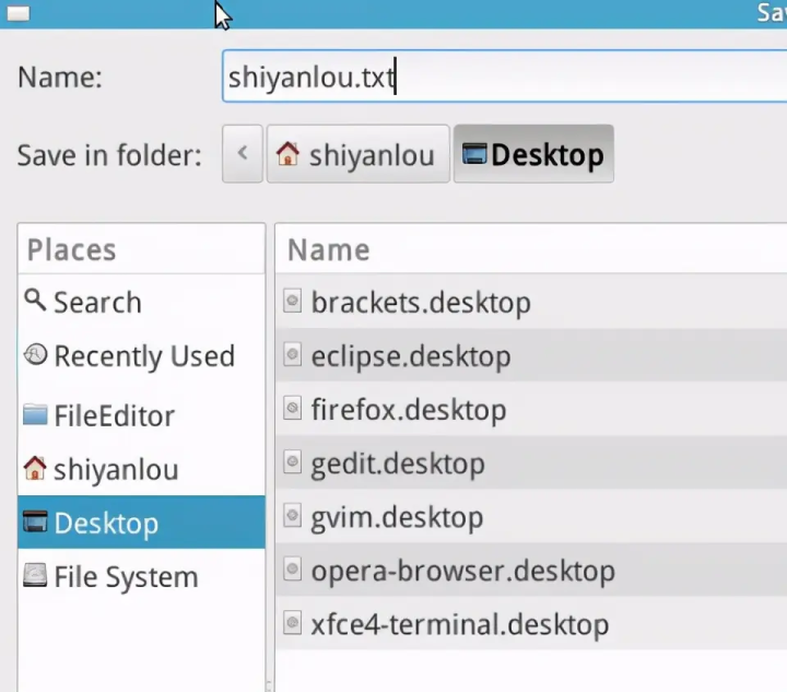 然后点击 save 按钮,出现下面这个对话框,Name 可以填写 shiyanlou.txt,Places 选择 Desktop 。