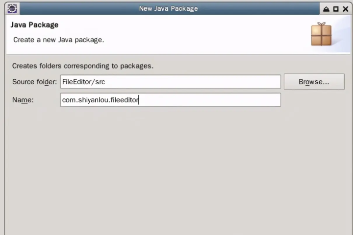 (2)弹出的对话框中, Name 一栏填写:com.shiyanlou.fileeditor,最后点击 Finish 按钮。