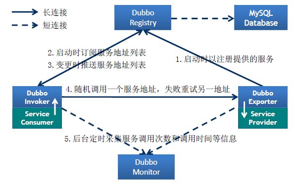 Monitor这是一个监控,图中虚线表明Consumer 和Provider通过异步的方式发送消息至Monitor,Consumer和Provider会将信息存放在本地磁盘,平均1min会发送一次信息。Monitor在整个架构中是可选的(图中的虚线并不是可选的意思),Monitor功能需要单独配置,不配置或者配置以后,Monitor挂掉并不会影响服务的调用。