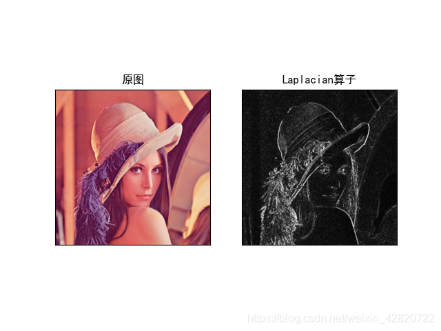 Laplacian = cv2.convertScaleAbs(dst)plt.rcParams['font.sans-serif'] = ['SimHei']titles = [u'原图',u'Laplacian算子']