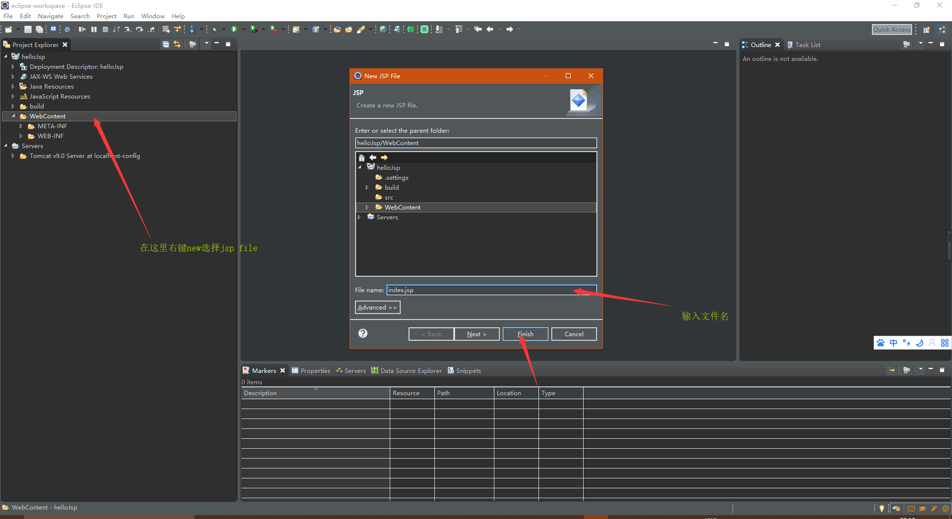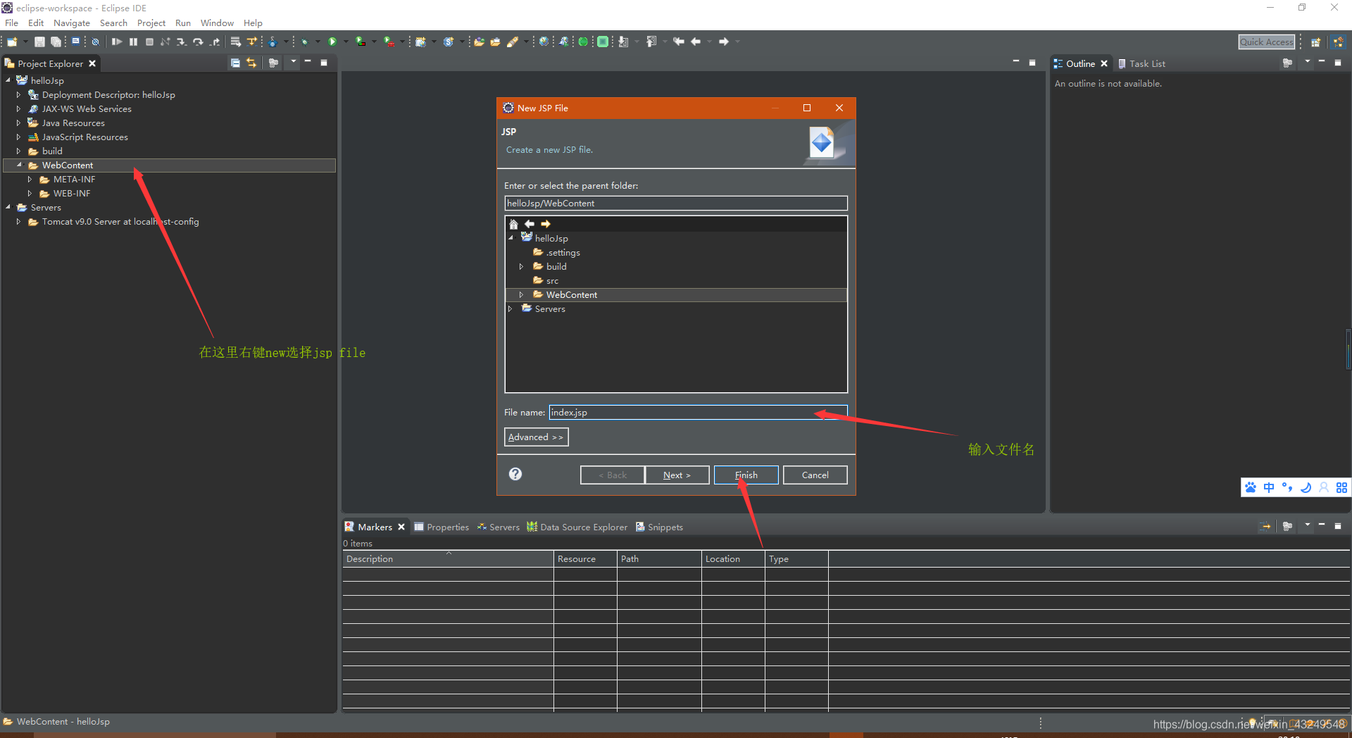 3.新建jsp文件index.jsp(不能将该文件放在WEB-INF目录下,若执行此操作,该文件将不能被外界 客户端 直接访问,只能通过请求转发访问),并放在WebContent里面。