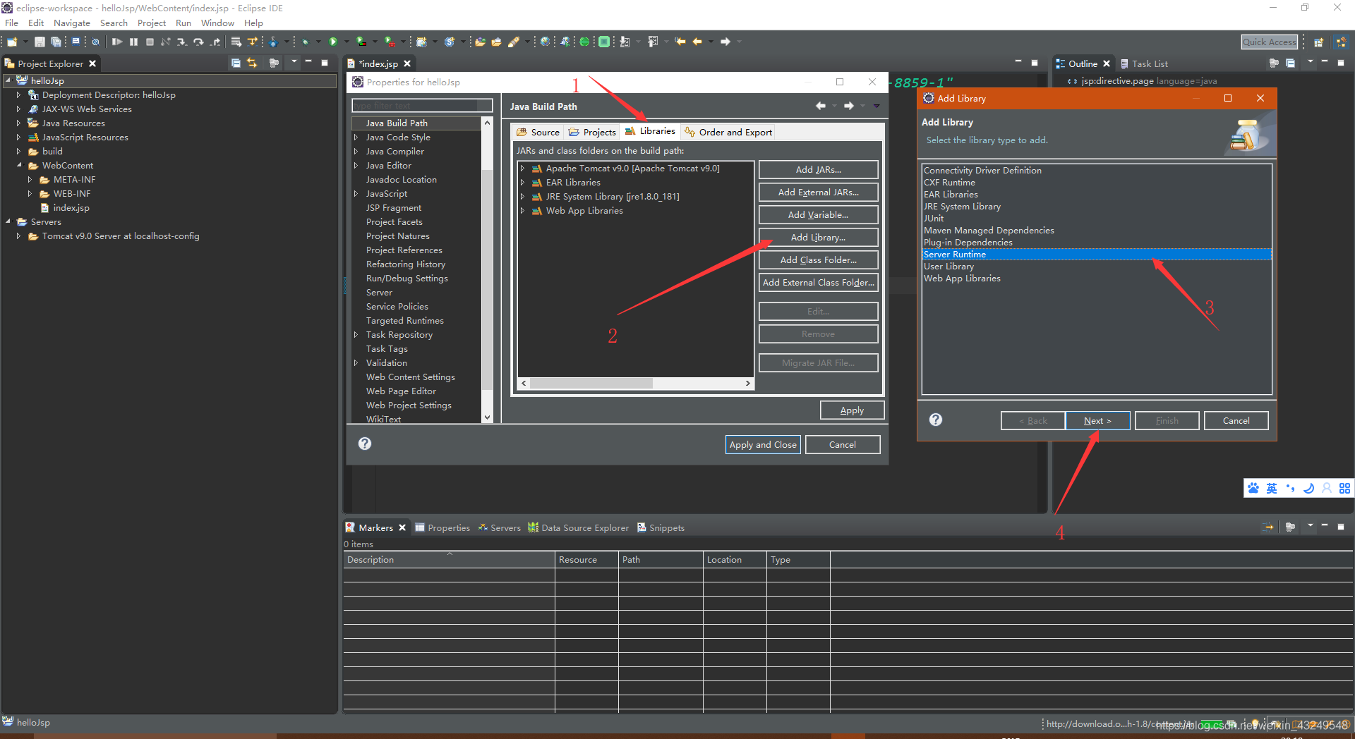 在项目上右键选择build path,点进去然后按照以下步骤设置,这一步其实是将tomcat中lib里的jar包导入至eclipse中