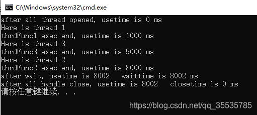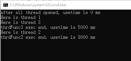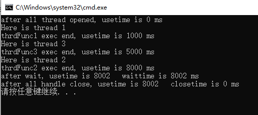 {clock_t t_start = clock();g_semp[0] = CreateSemaphore(NULL, 1, 1, NULL);g_semp[1] = CreateSemaphore(NULL, 1, 1, NULL);g_semp[2] = CreateSemaphore(NULL, 1, 1, NULL);g_thrd[0] = CreateThread(NULL, 0, thrdFunc1, (LPVOID)"thread 1", 0, NULL);g_thrd[1] = CreateThread(NULL, 0, thrdFunc2, (LPVOID)"thread 2", 0, NULL);g_thrd[2] = CreateThread(NULL, 0, thrdFunc3, (LPVOID)"thread 3", 0, NULL);clock_t t_point1 = clock();cout << "after all thread opened, usetime is " << t_point1 - t_start << " ms" << endl;::WaitForMultipleObjects(g_num, g_thrd, true, INFINITE);clock_t t_point2 = clock();cout << "after wait, usetime is " << t_point2 - t_start << " waittime is " << t_point2 - t_point1 << " ms" << endl;CloseHandle(g_thrd[0]);CloseHandle(g_thrd[1]);CloseHandle(g_thrd[2]);CloseHandle(g_semp[0]);CloseHandle(g_semp[1]);CloseHandle(g_semp[2]);clock_t t_end = clock();cout << "after all handle close, usetime is " << t_end - t_start << " closetime is " << t_end - t_point2 << " ms" << endl;