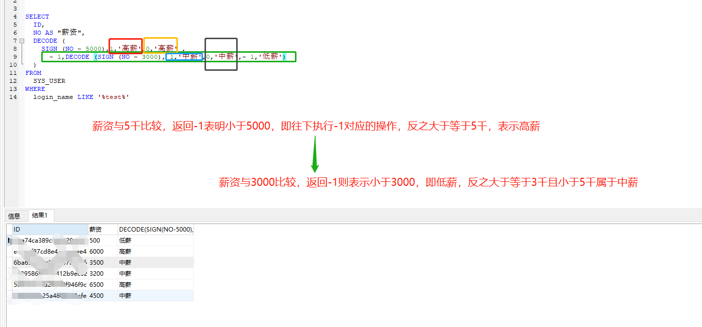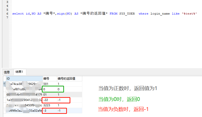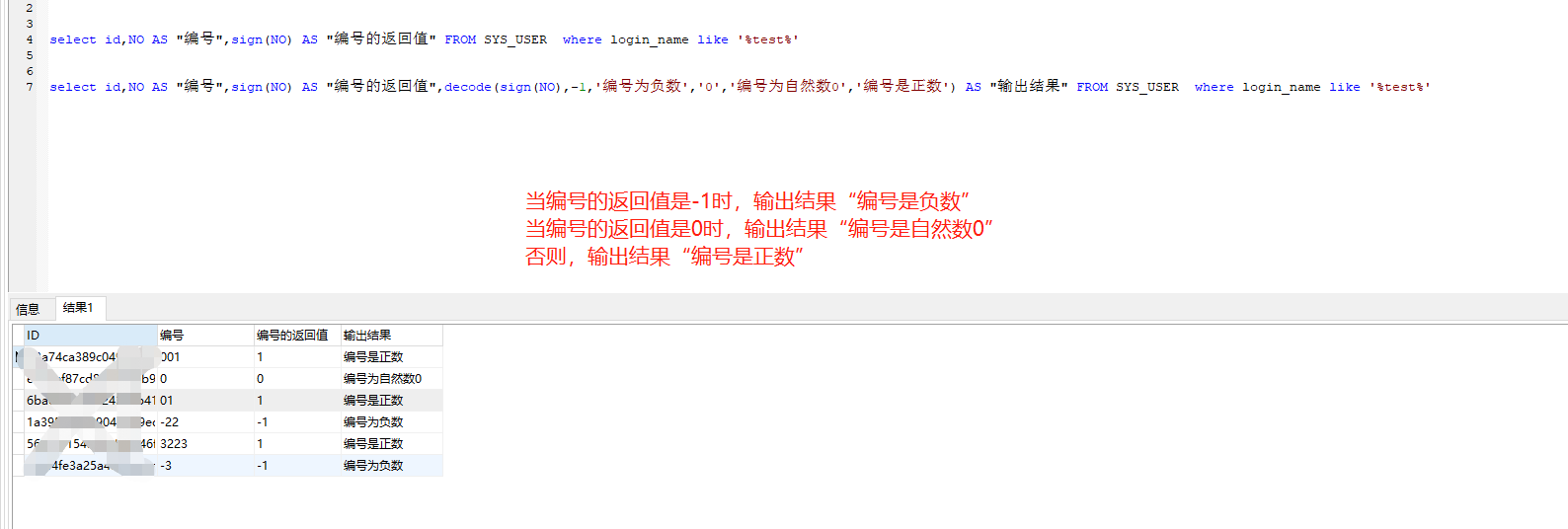 select id,NO AS "编号",sign(NO) AS "编号的返回值" FROM SYS_USER where login_name like '%test%'select id,NO AS "编号",sign(NO) AS "编号的返回值",decode(sign(NO),-1,'编号为负数','0','编号为自然数0','编号是正数') AS "输出结果" FROM SYS_USER where login_name like '%test%'SELECTID,NO AS "薪资",DECODE (SIGN (NO - 5000),1,'高薪',0,'高薪' ,- 1,DECODE (SIGN (NO - 3000), 1,'中薪',0,'中薪',- 1,'低薪'))