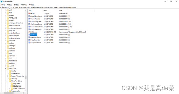 b.修改「Enabled」设定为1,打开NTP服务器功能。(默认是不开启NTP Server服务,除非计算机升级成为域控制站)
