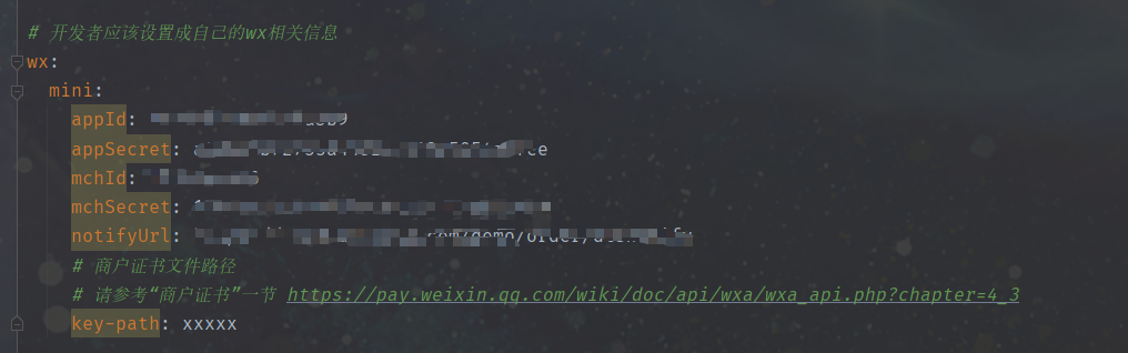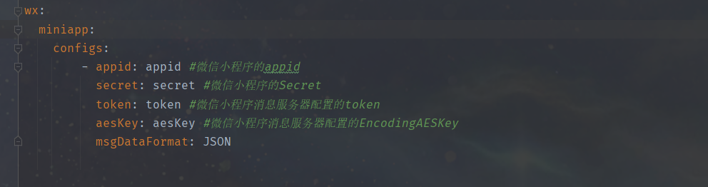 wx:miniapp:configs:- appid: appid #微信小程序的appidsecret: secret #微信小程序的Secrettoken: token #微信小程序消息服务器配置的tokenaesKey: aesKey #微信小程序消息服务器配置的EncodingAESKeymsgDataFormat: JSON