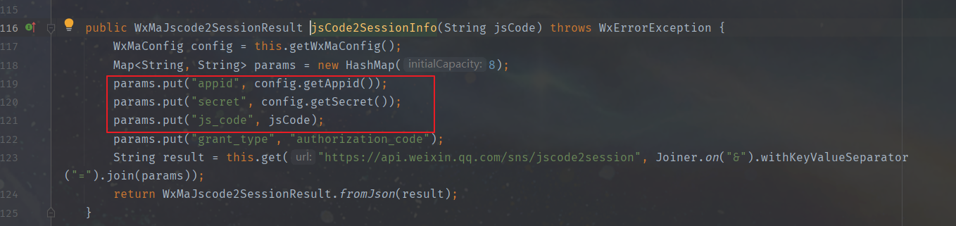 可以看出来这里的appid 和secret 和从WxMaconfig中获取的,这就是我们之前WxMaService设置的config