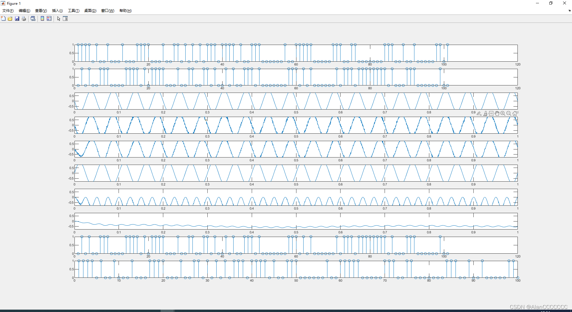 subplot(10,1,10);stem(sig_out1);%转换完成的绝对码