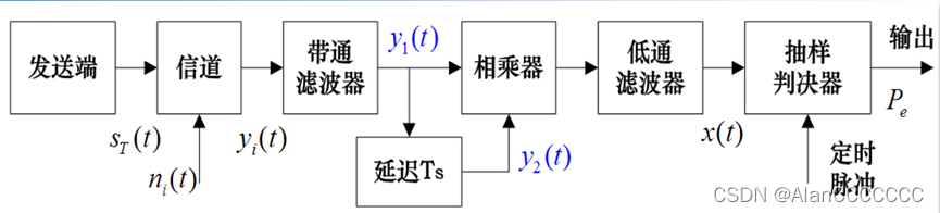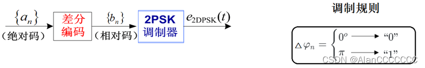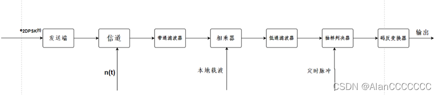 2DPSK信号的解调主要有两种方法。第一种方法是直接比较相邻码元的相位,从而判决接收码元是“0”还是“1”。为此,需要将前一码元延迟1码元时间,然后将当前码元的相位和前一码元的相位作比较。这种方法称为相位比较法。此方法对于延迟单元的延时精度要求很高,较难做到,所以应用较少。第二种方法是先把接收信号当做绝对相移信号进行相干解调,解调后的码序列是相对码;然后再将此相对码序列作闻逆码变换,还原成绝对码,即原基带信号码元序列。这种相干解调法又称极性比较法。