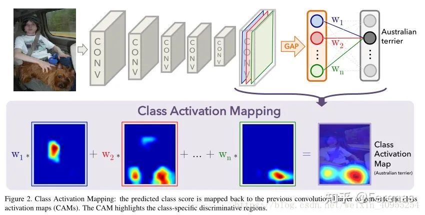 文章题目叫Learning Deep Features for Discriminative Localization,google百度一下都可以找到。这篇文章其实是想探究我们的CNN在学习图像的时候到底重点关注在哪个部分。这里抛开论文里面的繁琐的数学解释啥的(大家可以看看原论文),最后论文用一张图表示了这个大概是怎么样的一个过程。