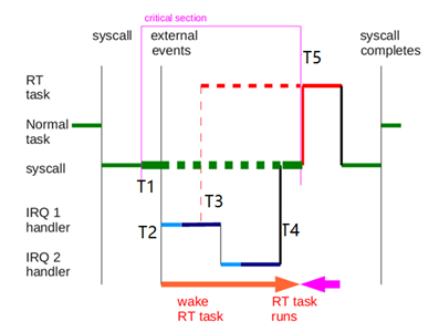 如下图,一个绿色的普通进程在T1时刻持有spin_lock进入一个critical section(该核调度被关),绿色进程T2时刻被中断打断,而后T3时刻IRQ1里面唤醒了红色的RT进程(如果是硬实时RTOS,这个时候RT进程应该能抢入),之后IRQ1后又执行了IRQ2,到T4时刻IRQ1和IRQ2都结束了,红色RT进程仍然不能执行(因为绿色进程还在spin_lock里面),直到T5时刻,普通进程释放spin_lock后,红色RT进程才抢入。从T3到T5要多久,鬼都不知道,这样就无法满足硬实时系统的“可预期”延迟性,因此Linux不是硬实时操作系统。