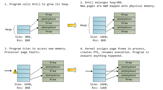 如下图,最初的堆是8KB,这8KB也写过了,所以堆的vss和rss都是8KB。此后我们调用brk()把堆变大到16KB,但是实际上它占据的内存rss还是8KB,因为第3页还没有写,根本没有真正从内存条上拿到内存。直到写第3页,堆的rss才变为12KB。这就是Linux针对app的lazy分配机制,它的出发点,当然也是防止应用程序傻逼了。