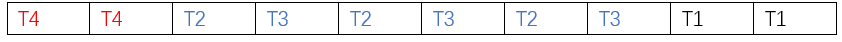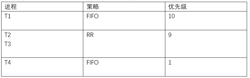 Linux的进程,对于RT进程而言,按照SCHED_FIFO和SCHED_RR的策略,优先级高先执行;优先级高的睡眠了后优先级的执行;同等优先级的SCHED_FIFO先ready的跑到睡,后ready的接着跑;而同等优先级的RR则进行时间片轮转。比如Linux存在如下4个进程,T1~T4(内核里面优先级数字越低,优先级越高):