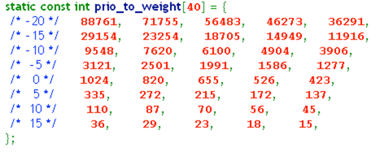 其中NICE_0_LOAD是1024,也就是NICE是0的进程的weight。vruntime是进程的虚拟运行时间,pruntime是物理运行时间,weight是权重,权重完全由nice决定,如下表: