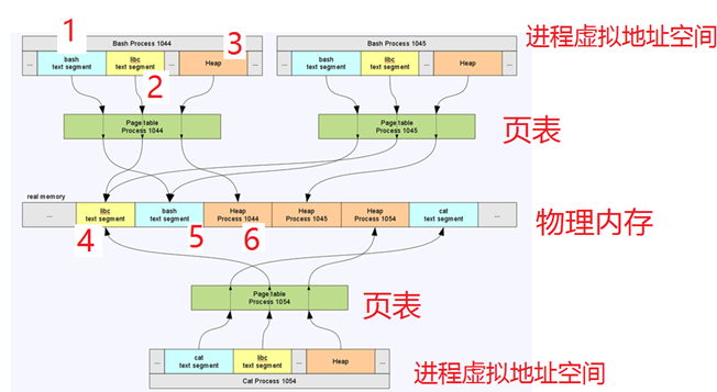 下面的一幅图上有3个进程,pid为1044的 bash、pid为1045的 bash和pid为1054的 cat。每个进程透过自己的页表,把虚拟地址空间指向内存条上面的物理地址,每次切换一个进程,即切换一份独特的页表。