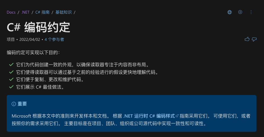 每一个编程语言 ,都有自己的编写规范, 也是评价好的代码的标准 。 在官方有非常好的编码规则建议大家阅读(C# 编码约定 | Microsoft Docs), 这对写好 C# 的代码非常有帮助 , 你也可以多看看 GitHub 上的开源项目, 也会有很大帮助。