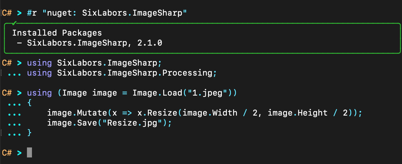 当然你也可以在 REPL 内通过 nuget 增加相关的第三方库/包进行测试 , 如 ImageSharp