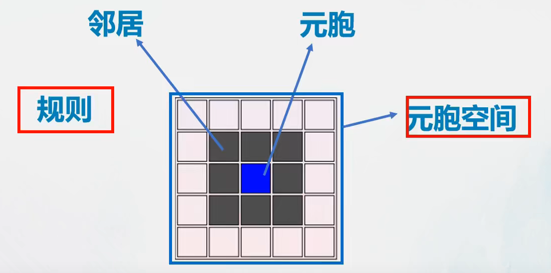 元胞自动机由元胞、元胞空间、元胞邻居、元胞规则组成。