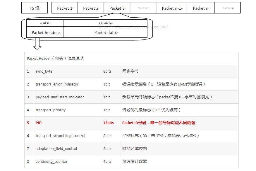TS流是由一个个Packet(包)构成的,每个包都是由Packet Header(包头)和Packet Data(包数据)组成的。其中Packet Header指示了该Packet是什么属性的,并给出了该Packet Data的数据的唯一网络标识符PID。
