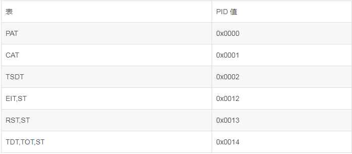 PID是TS流中唯一识别标志,Packet Data是什么内容就是由PID决定的。如果一个TS流中的一个Packet的Packet Header中的PID是0x0000,那么这个Packet的Packet Data就是DVB的PAT表而非其他类型数据(如Video、Audio或其他业务信息)。下表给出了一些表的PID值,这些值是固定的,不允许用于更改。