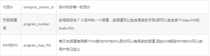 PAT表主要包含频道号码和每一个频道对应的PMT的PID号码,这些信息我们在处理PAT表格的时候会保存起来,以后会使用到这些数据。下面将PAT表的定义给出:
