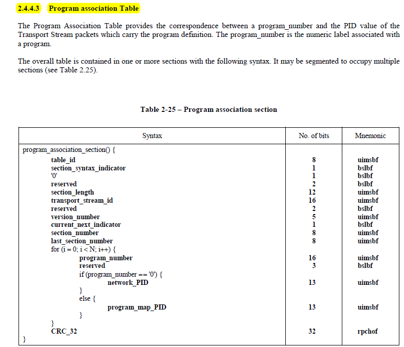 从for()开始,就是描述了当前流中的频道数目(N),每一个频道对应的PMT PID是什么。解复用程序需要接收所有的频道号码和对应的PMT 的PID,并把这些信息在缓冲区中保存起来。在后部的处理中需要使用到PMT的 PID。