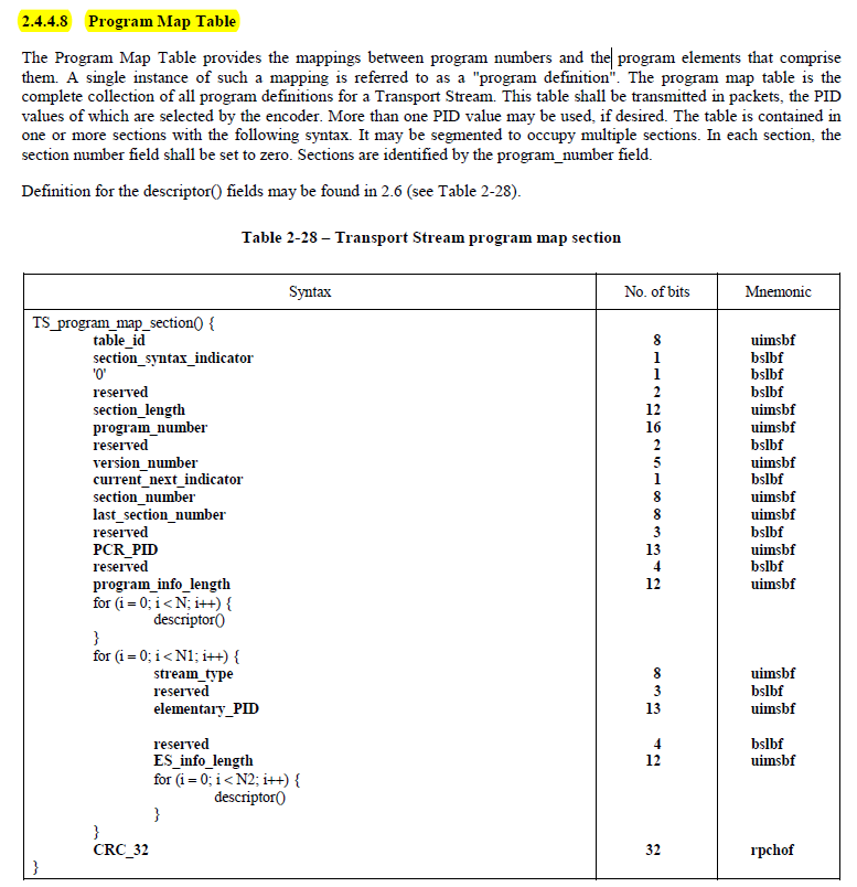 {unsigned table_id : 8; //固定为0x02, 表示PMT表 unsigned section_syntax_indicator : 1; //固定为0x01 unsigned zero : 1; //0x01 unsigned reserved_1 : 2; //0x03 unsigned section_length : 12;//首先两位bit置为00,它指示段的byte数,由段长度域开始,包含CRC。 unsigned program_number : 16;// 指出该节目对应于可应用的Program map PID unsigned reserved_2 : 2; //0x03 unsigned version_number : 5; //指出TS流中Program map section的版本号 unsigned current_next_indicator : 1; //当该位置1时,当前传送的Program map section可用; //当该位置0时,指示当前传送的Program map section不可用,下一个TS流的Program map section有效。 unsigned section_number : 8; //固定为0x00 unsigned last_section_number : 8; //固定为0x00 unsigned reserved_3 : 3; //0x07 unsigned PCR_PID : 13; //指明TS包的PID值,该TS包含有PCR域, //该PCR值对应于由节目号指定的对应节目。 //如果对于私有数据流的节目定义与PCR无关,这个域的值将为0x1FFF。 unsigned reserved_4 : 4; //预留为0x0F unsigned program_info_length : 12; //前两位bit为00。该域指出跟随其后对节目信息的描述的byte数。 std::vector<TS_PMT_Stream> PMT_Stream; //每个元素包含8位, 指示特定PID的节目元素包的类型。该处PID由elementary PID指定 unsigned reserved_5 : 3; //0x07 unsigned reserved_6 : 4; //0x0F unsigned CRC_32 : 32;
