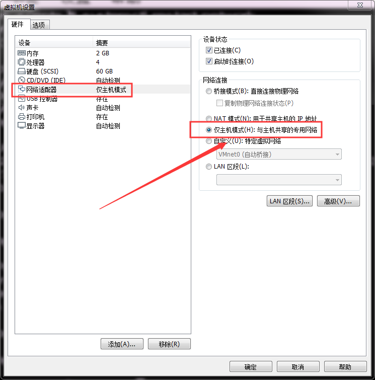 先使用“仅主机模式”,简单的实现虚拟机与本地物理机器通信