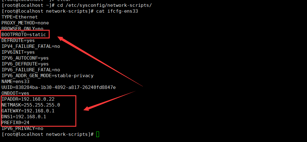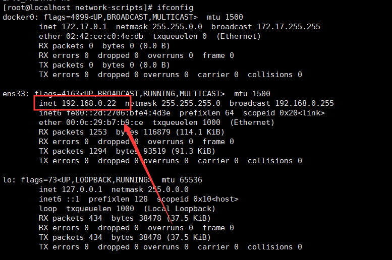 第四步:重启网卡,使用命令systemctl restart network,然后查看本地的IP地址,就可以实现互联。