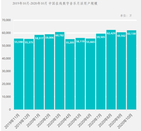 在线数字音乐用户月活规模稳定在60000万,规模体量巨大,增速放缓但仍有增长潜力,发展十分成熟。