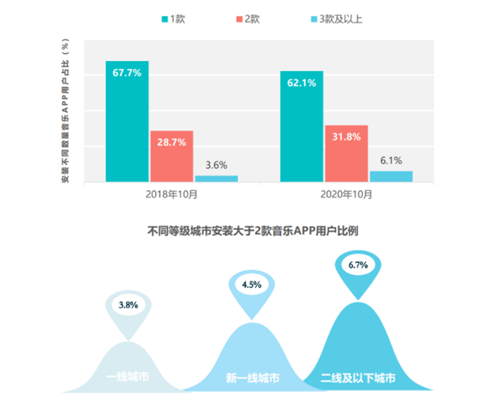 安装两款音乐APP及以上的用户占比有所上升,且在一线城市、新一线、二线及以下城市占比递增,原因可能在于用户对免费正版歌曲的需求。