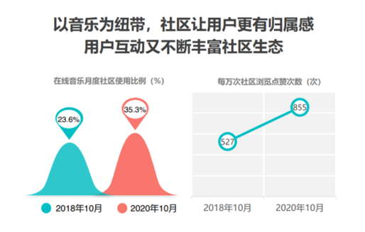 在线音乐平台社区使用比例稳步上升,用户对在线音乐APP社交功能需求增加;网易云音乐用户社区参与度远超QQ音乐。