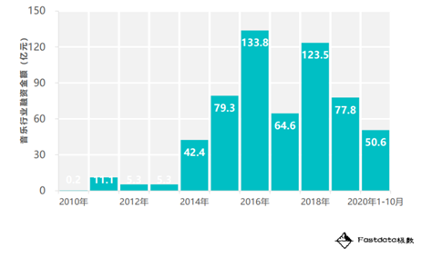 数据表明,从2010到2020年,音乐行业的融资总额总体呈现上升趋势。尤其是2013年到2014年涨幅极大。但2014到2019年,音乐行业的融资涨幅虽高但波动剧烈且频繁,最大波动达到60亿元。自2018年后,融资量趋向于逐年快速降低。