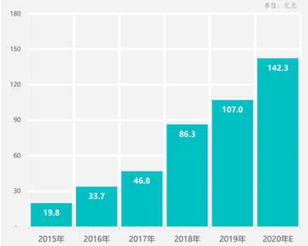 数据表明,从2015到2020年中国在线音乐市场产值是在快速不间断上涨的。尤其是2017年-2018年和2019-2020年E这两个时间段,涨幅很高,增长量达到40~60亿元。