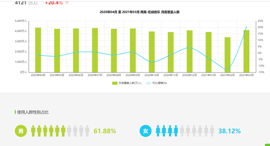 在线音乐行业战争已持续多年,如今形成腾讯音乐(QQ音乐、酷狗音乐、酷我音乐)与网易云音乐的两强格局,从三月的在线音乐APP独立设备规模上看,可以发现网易云音乐市场占额地位仍与腾讯音乐差距较大。(数据来源:艾瑞数据)
