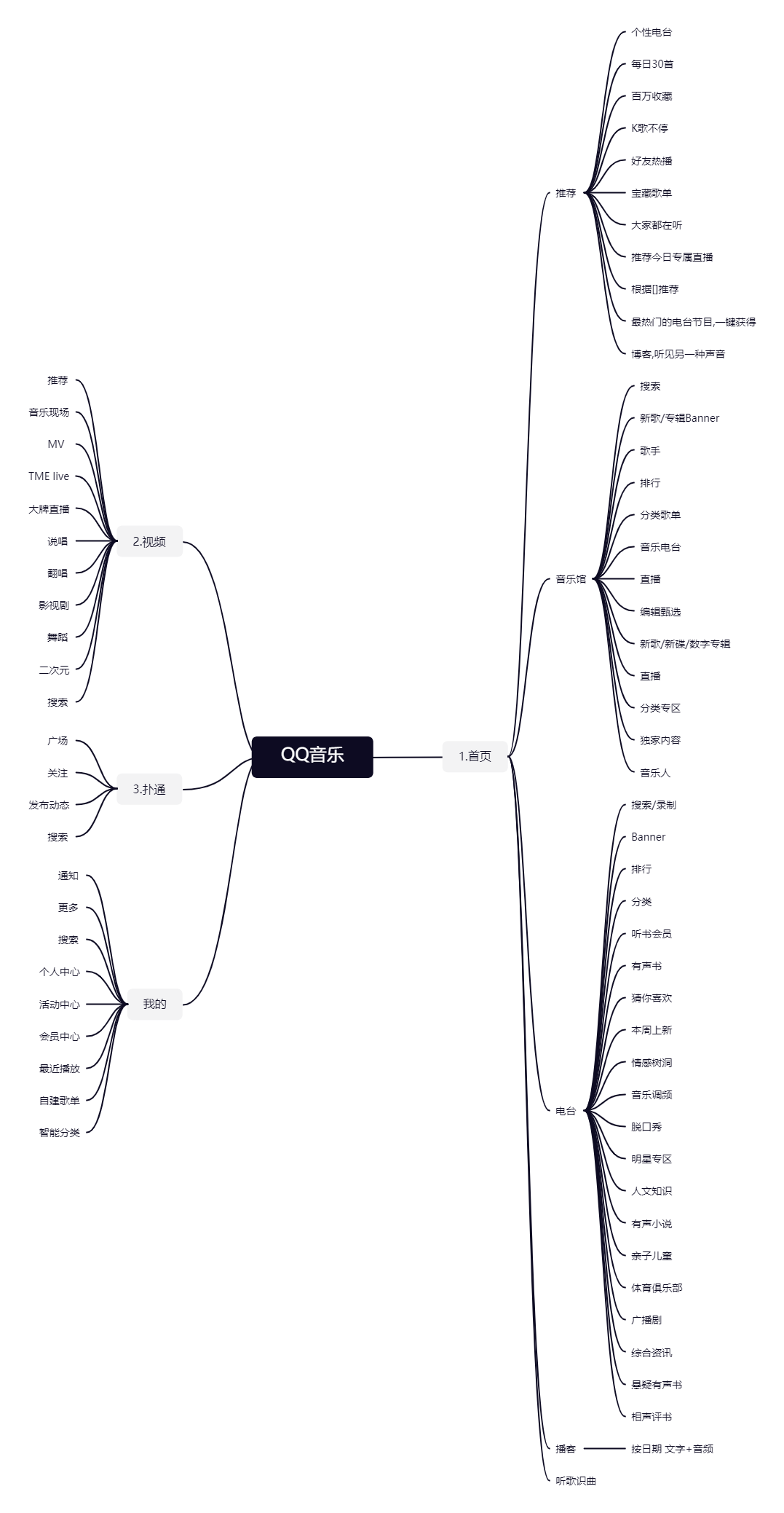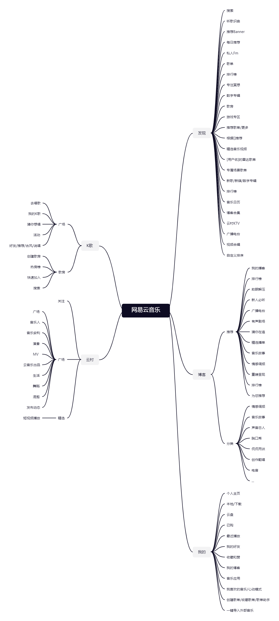 网易云音乐主要有五大功能模块,分别是发现、播客、我的、K歌、云村。页面底部为歌曲播放条,功能模块与QQ音乐涵盖得都很全面,但布局逻辑更加清晰;从结构图也可以看出网易云音乐在个性化推荐这一模块有更广的应用。