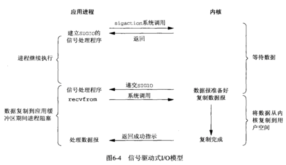 通过调用sigaction注册信号函数,等内核数据准备好的时候系统中断当前程序,执行信号函数(在这里面调用recv)。D同学让舍管阿姨等有水的时候通知他(注册信号函数),没多久D同学得知有水了,跑去装水。是不是很像异步IO?很遗憾,它还是同步IO(省不了装水的时间啊)。