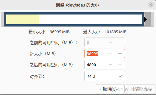在这个页面中,找到刚才记住的那一行(如果没记住的话, 就是"文件系统"这一列为"ext4"的这一行). 点击这一行,右键,选择"调整大小/移动"