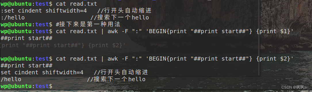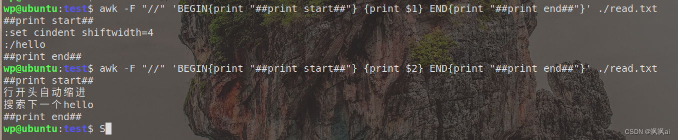 -F后面的:表示输入的分割条件,默认为空格、制表符、换行符。 -