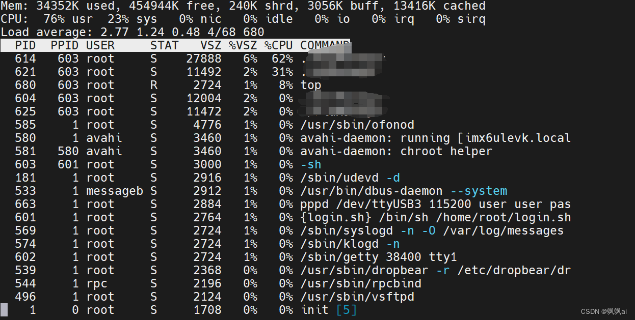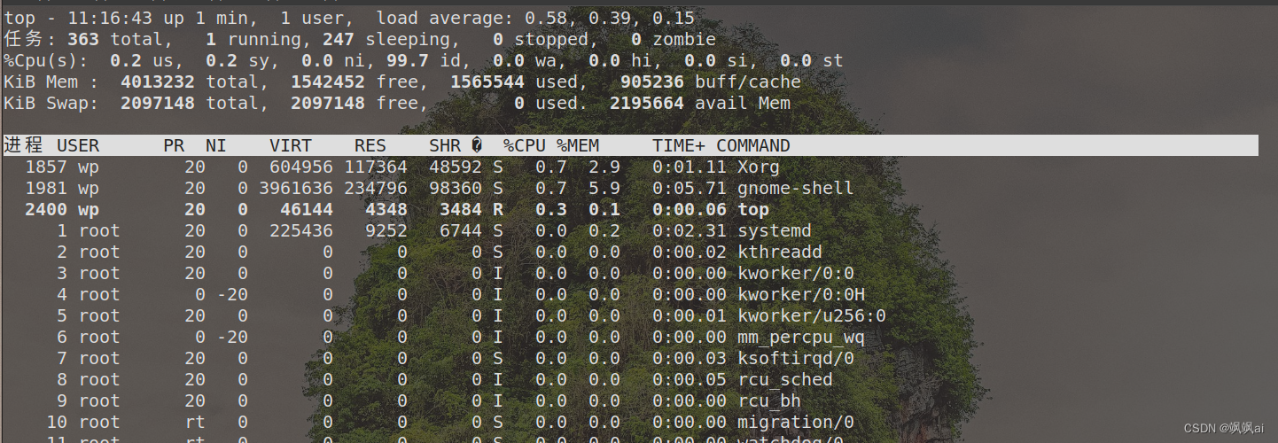linux的top命令相当于windows得任务管理器,用来监测系统CPU、内存等的使用情况。