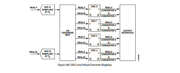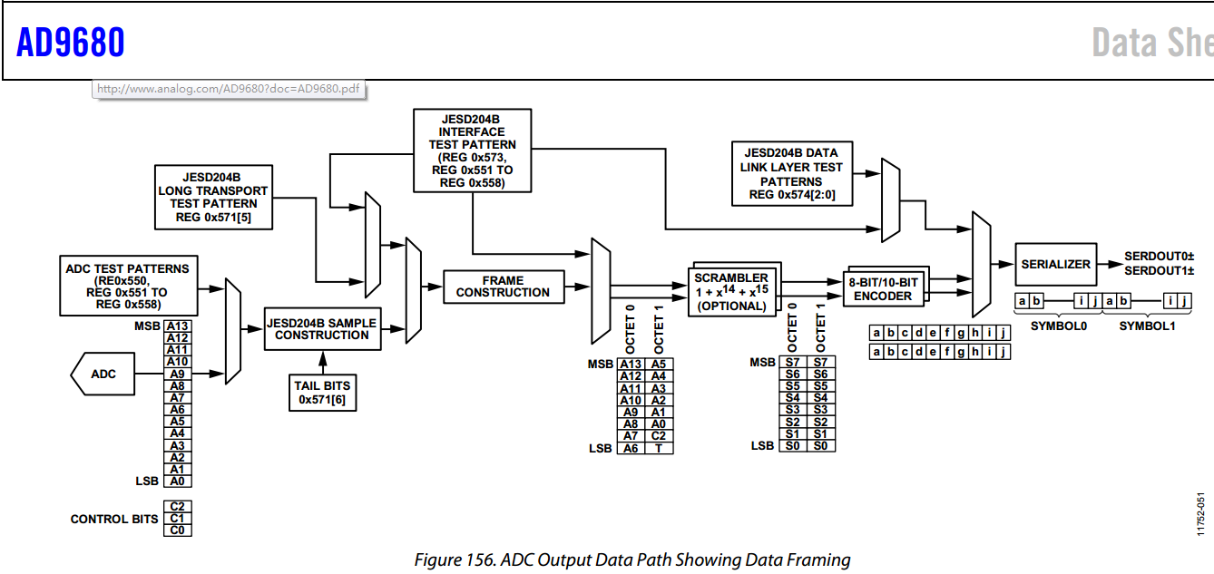 但是这个只是给大家的一个示例,而不是在设计时我们就能直接使用的数据。我们应该是根据自己选择的AD判断数据位是几位,控制位是几位,控制位是占的哪几位。这里以AD9680(14位双通道AD采集器)举例说明。