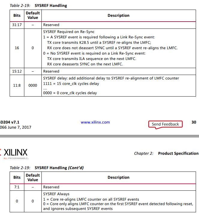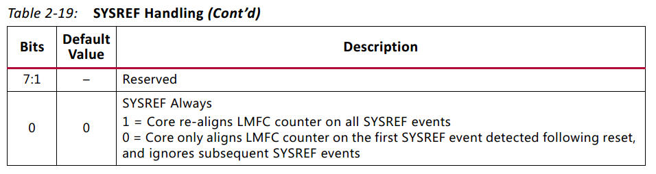 至于sysref的设置限制:sysref的周期必须是多帧周期的整数倍,如下IP核手册的描述。