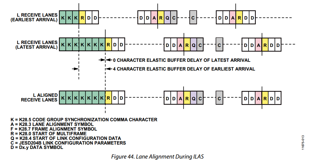 接收时,lanes信号的同步是指:在SYNC信号没有拉高之前会缓存到一个类似寄存器的缓存器中,且当SYNC拉高后根据缓存情况(所有线的多帧的第一个帧开头都缓存下来后),在确定性延时时间满了后在LMFC时接收到第一个多帧的第一个帧的帧头开始算是有效数据。