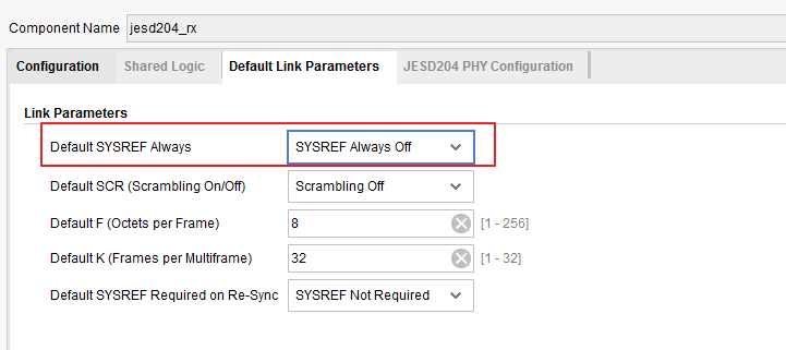 JESD204B使用子类1时,同步调试信号sysref主要通过AXI-Lite接口设置寄存器调整,也可在IP设置上也有默认设置选项。若在JESD204B的ip中设置了一种模式,在ADC或者DAC中也需要设置成相同的模式。如下图所示。