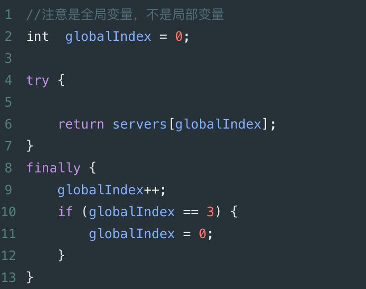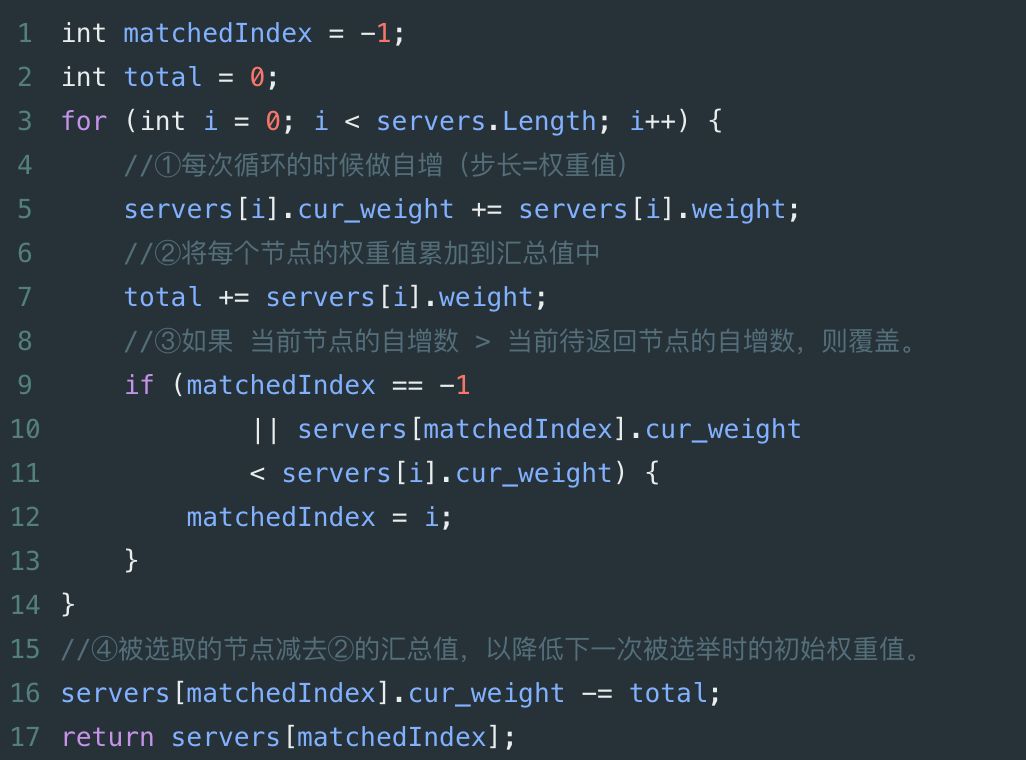 在轮询的基础上,增加了一个权重的概念。权重是一个泛化后的概念,可以用任意方式来体现,本质上是一个能者多劳思想。比如,可以根据宿主的性能差异配置不同的权重。大致的代码如下: