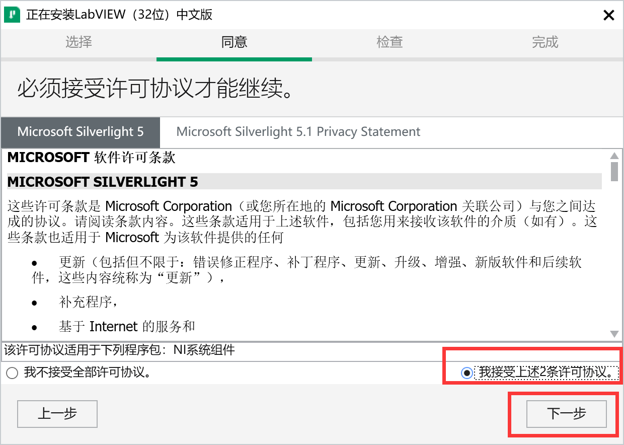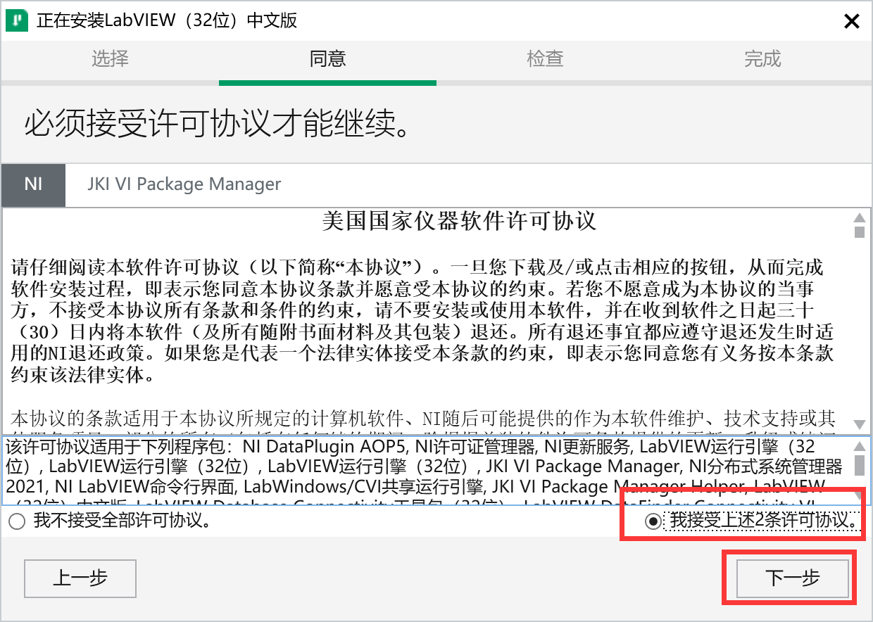 6、选中“我接受上述2条许可协议”,点击下一步。