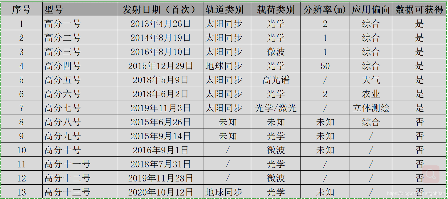 截止到目前(2020-10)为止,高分系列已经从高分一号发展到高分十三号,其中: