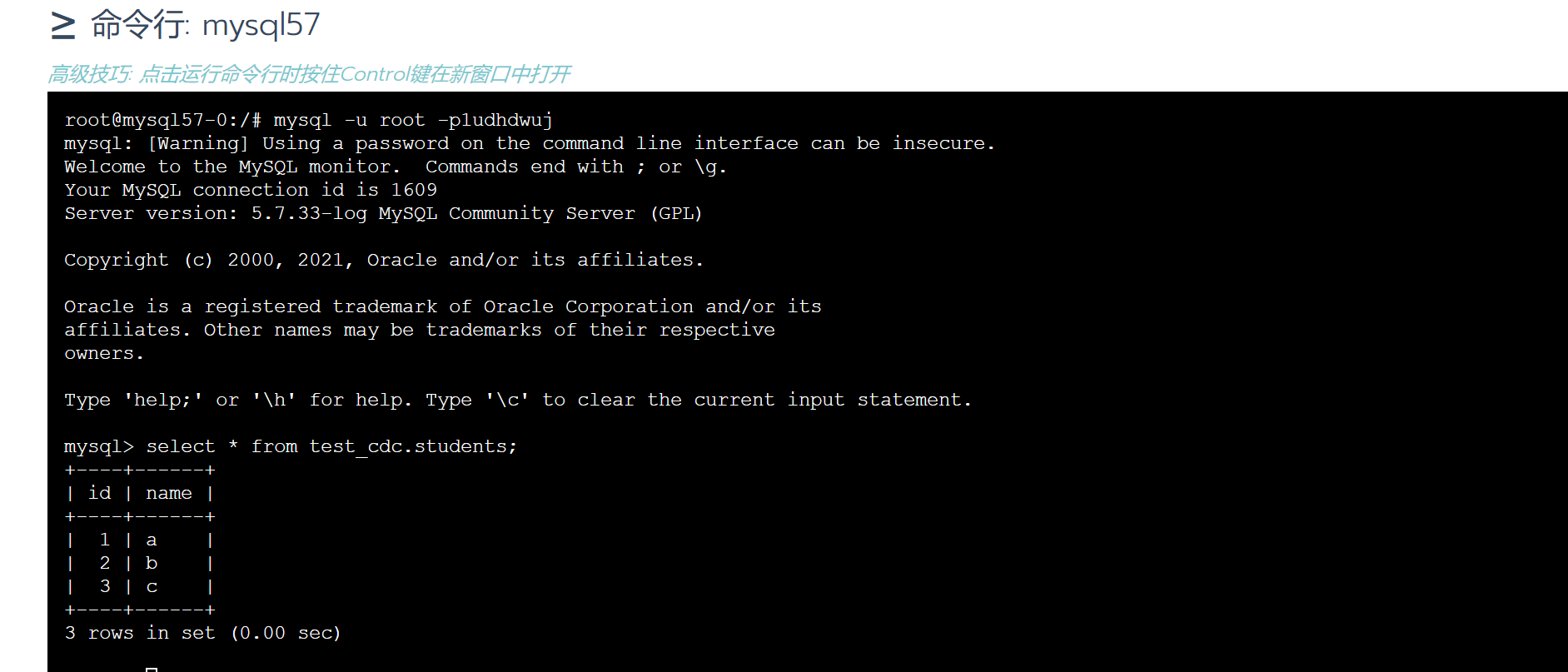 Query OK, 1 row affected (0.005 sec) MySQL [test_cdc]> insert into students values(3,'c');